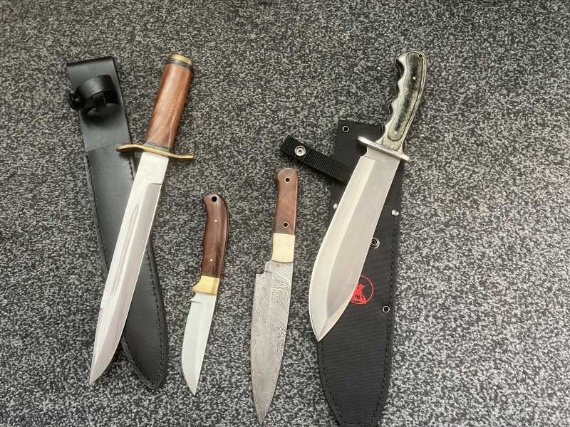 Verkaufe kleine Messersammlung (4Messer): Bowiemesser, Damastmesser, etc. siehe Bild. Teilweise mit Scheide, teilw. ohne. Alle unbenutzt, daher eigentlich neu, natürlich evtl. mit kl. Lagerspuren.