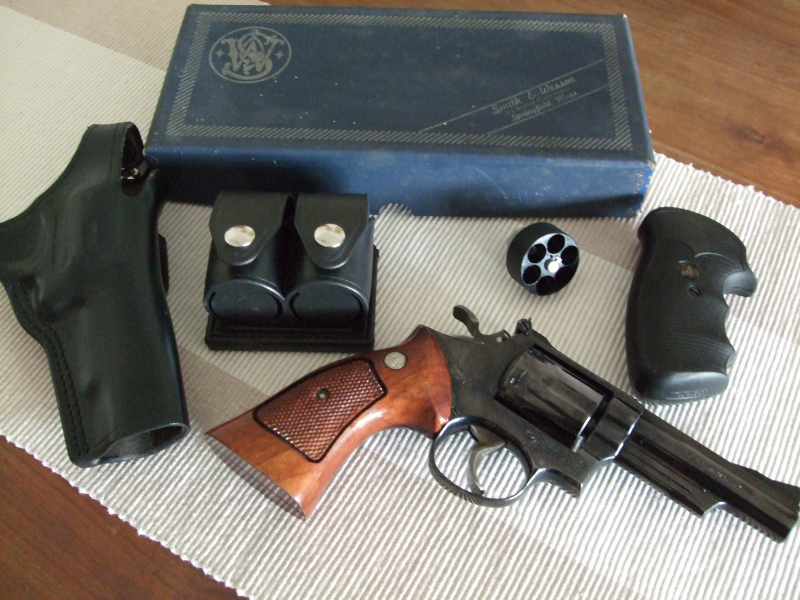 Biete einen neuwertigen Revolver des Hersteller Smith & Wesson, Modell 19-3 mit 4 Zoll Lauf und viel Zubehör (Siehe Fotos). Die Waffe ist technisch und optisch in gutem Zustand, Griffschalen aus Gummi und Schnell-Ladehilfen, ein passendes Lederholster und der Original-Karton runden die gepflegte Waffe ab.