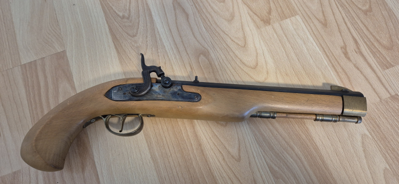 Zum Verkauf steht eine klassische Vorderlader-Pistole Kentucky im Kaliber .45 des spanischen Herstellers Dikar. Diese hochwertige Replik einer historischen Schwarzpulver-Pistole überzeugt durch ihr traditionelles Design mit Holzschaft und Messingbeschlägen.