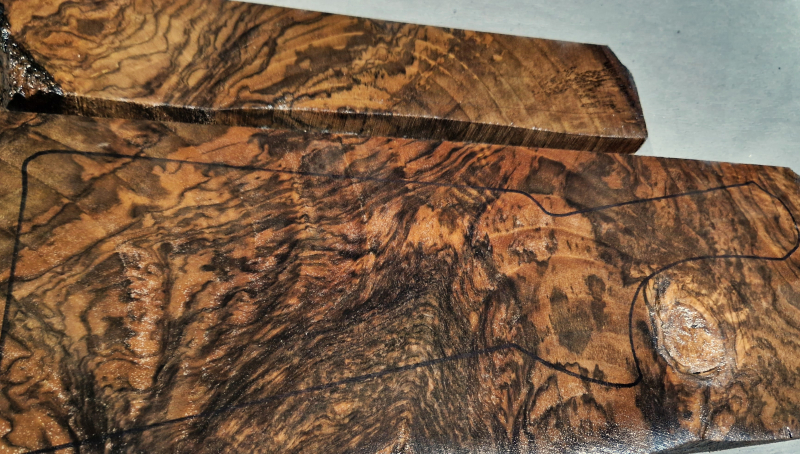 Die ersten Fotos wurden auf einem leicht feuchten Holzstück aufgenommen, um die Farben besser sichtbar zu machen. Das letzte Foto zeigt die Maße in Zentimetern. Die Umrisse entsprechen den tatsächlichen Abmessungen der Blaser F3. Die Stücke wurden über fünf Jahre luftgetrocknet. Sie wurden nicht dampfbehandelt, um die Farben und Kontraste des Tscherkassy-Nussbaums zu erhalten. Sie wurden gegen Holzwürmer und Insekten behandelt.