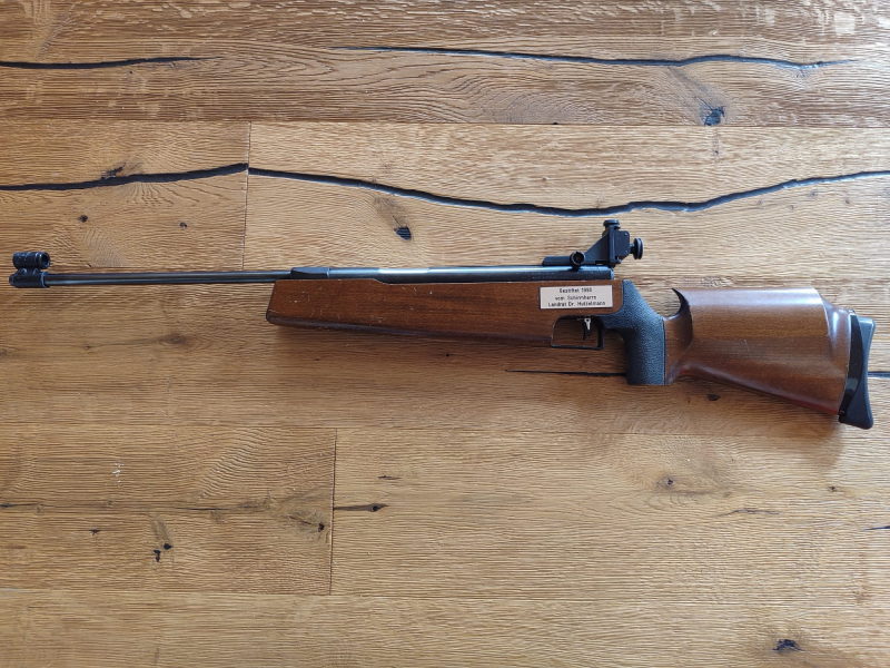 Es handelt sich um ein gebrauchtes Sport Luftdruckgewehr verstellbaren Diopter.Im vorderen Korntunnel ist ein 4 mm Ringkorn verbaut. Laut Seriennummer wurde das Luftdruckgewehr im Jahr 1983 produziert.