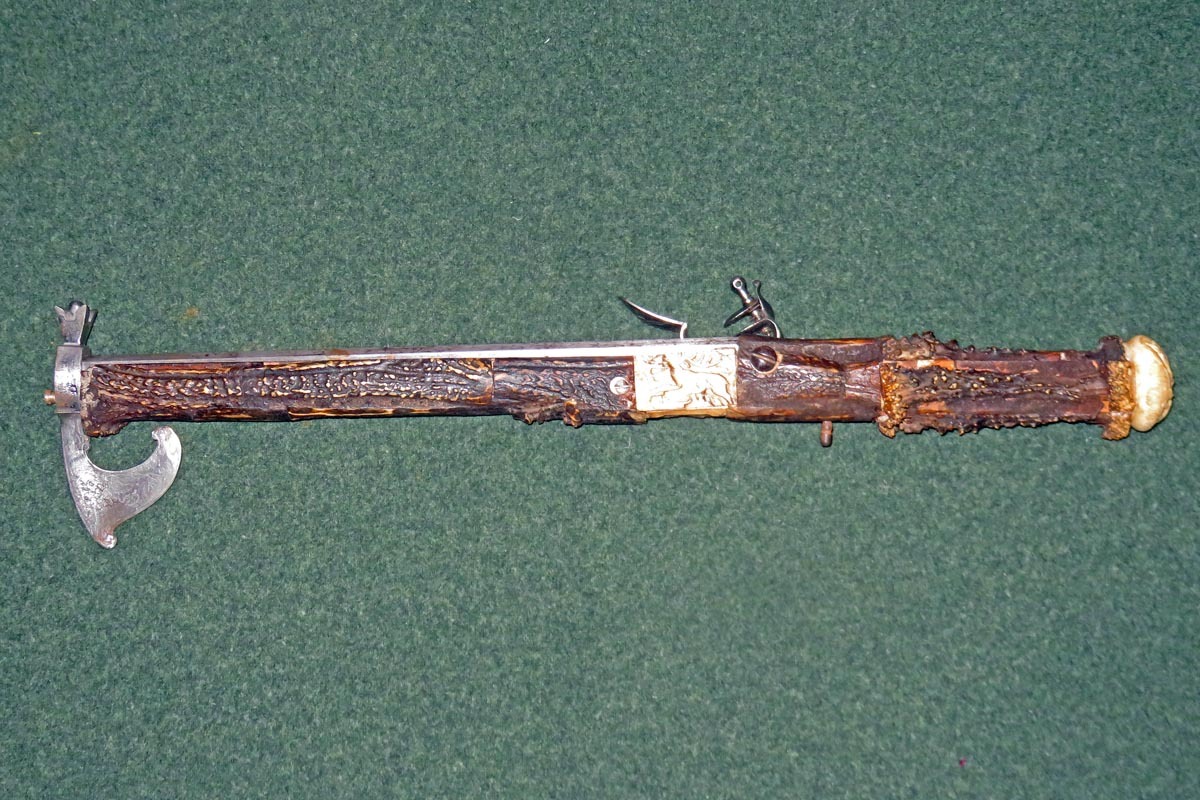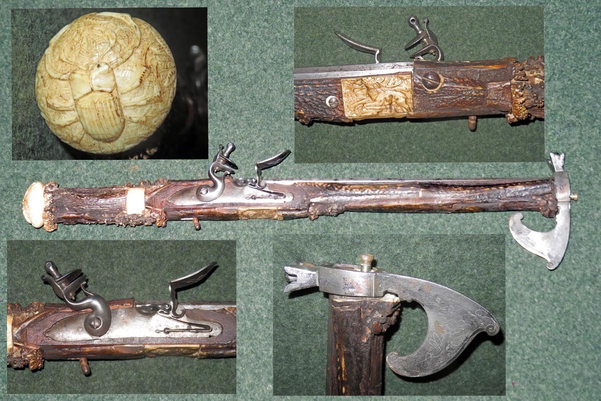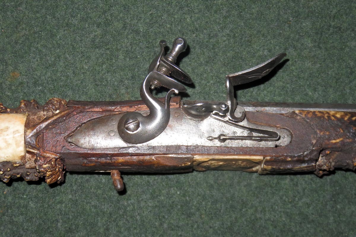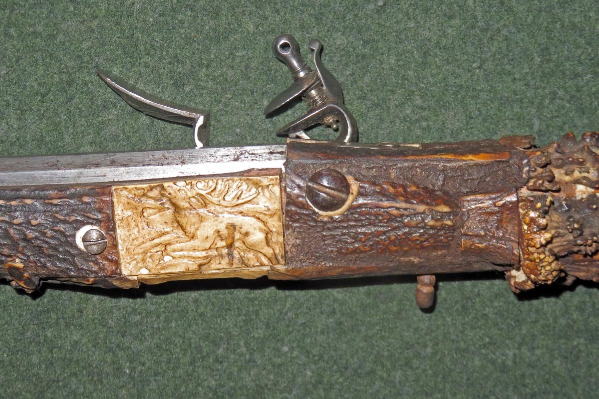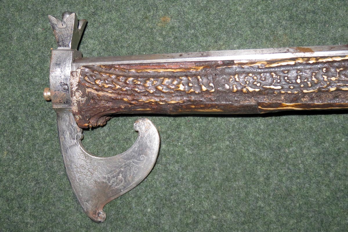 Die schießende Axt ist aufwändig mit Hirschhorn belegt, sowie mit gravierten Beineinlagen und sehr fein gearbeiteten Griffabschluss (Hirschkäfer) versehen und hat ein originales Steinschloss aus dem späten 18. Jahrhundert.