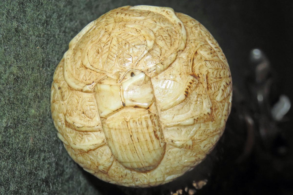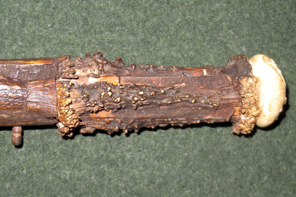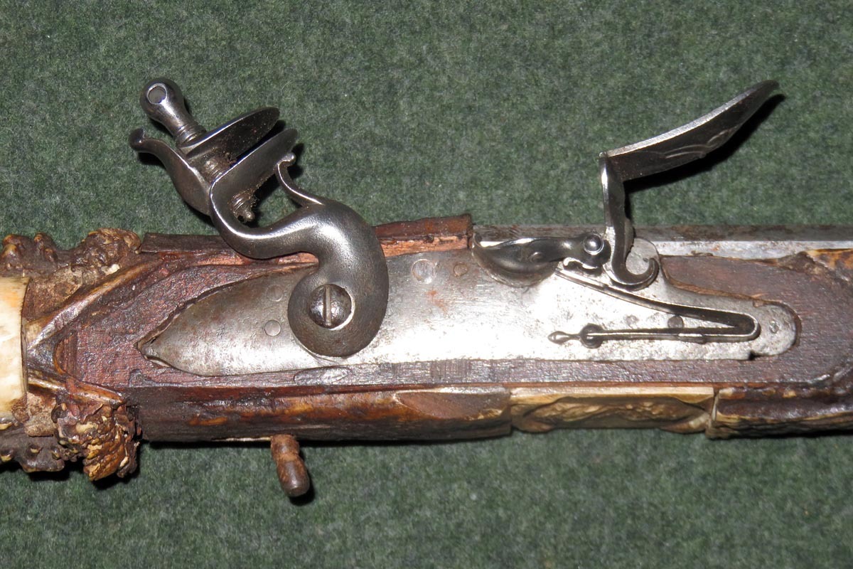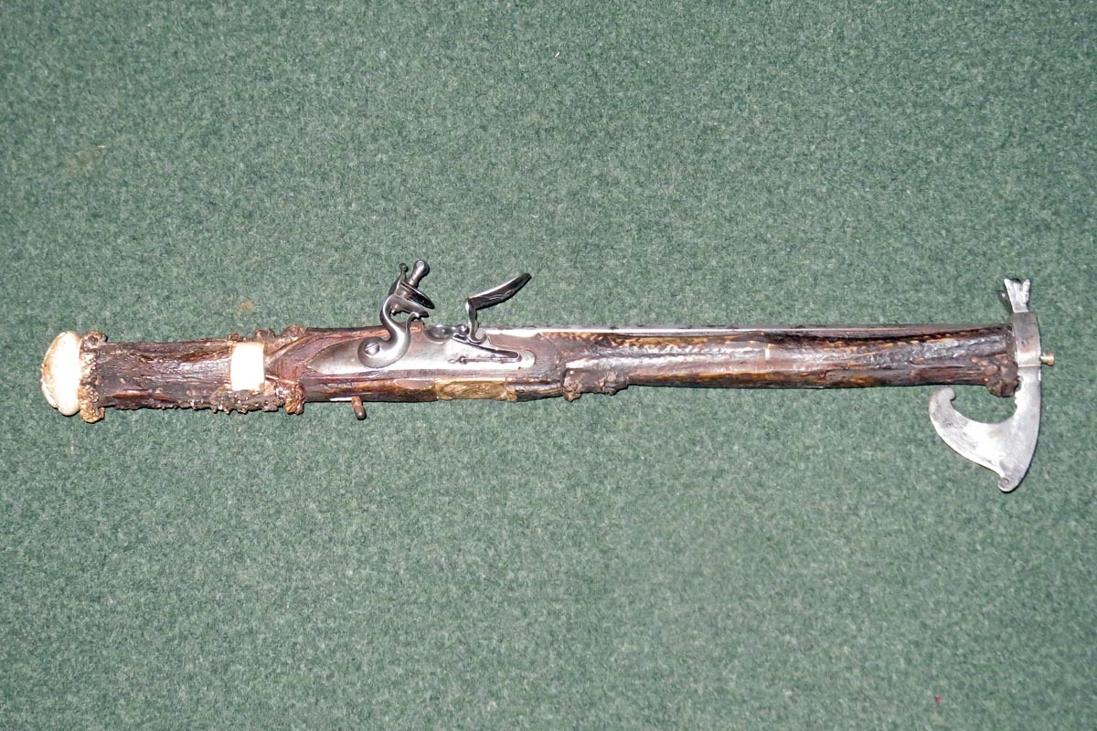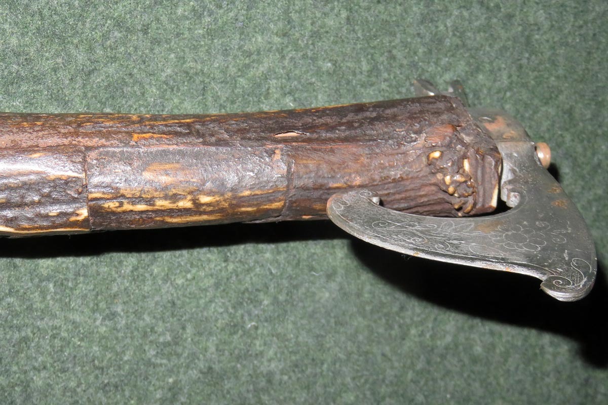 Die schießende Axt ist aufwändig mit Hirschhorn belegt, sowie mit gravierten Beineinlagen und sehr fein gearbeiteten Griffabschluss (Hirschkäfer) versehen und hat ein originales Steinschloss aus dem späten 18. Jahrhundert.
