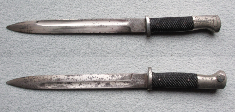 Bajonett/ Ausgeh Seitengewehr M84/98 für 98K. Das Bajonett ist noch gut erhalten, die Klinge hat etwas Rostfraß und wurde noch nicht beschliffen. An der Klinge ist der Hersteller WKC erkennbar, die Verchromung ist noch gut erhalten und die Griffschalen sind aus Bakelit, geriffelt.