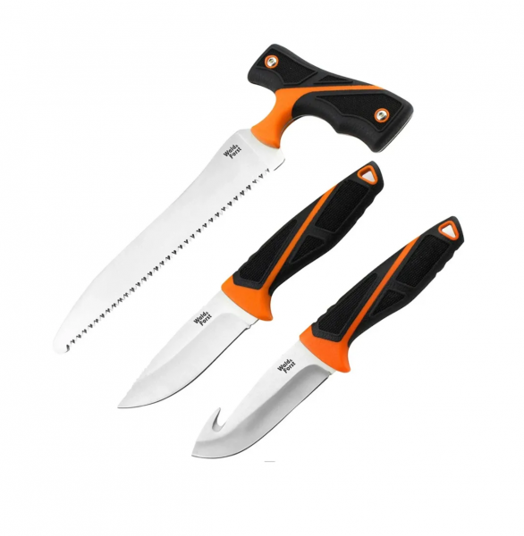 Das Wald & Forst Aufbrech- und Zerwirk-Set ist die ideale Komplettlösung für Jäger, die Wert auf sicheres, effizientes und sauberes Arbeiten legen. Dieses 3-teilige Set besteht aus zwei spezialisierten Messern und einer kräftigen Aufbrechsäge, alle gefertigt aus rostfreiem 420er-Stahl. Die ergonomisch geformten Griffe in Signalorange gewährleisten durch ihre rutschhemmenden TPR-Einlagen höchste Sicherheit – selbst bei Nässe oder Kälte bleibt das Werkzeug stets fest in der Hand.