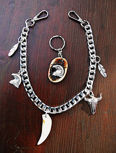 Hier eine unbenutzte Uhrenkette für die Taschenuhr, Silberfarben mit Anhänger. 40cm Länge und ein Schlüsselbund mit Anhänger, auf Hirschhorn Platte. Rest siehe Bild.