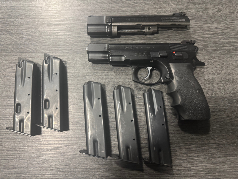 Pistole CZ 75 Kal. 9mm Luger 5 Zoll inkl. Wechselsystem Kadet 22lr. Zustand ist in Ordnung, siehe Bilder. 2 Magazine 22lr, 3 Magazine 9mm Luger. Ware stammt aus einer Auflösung und wird im Kundenauftrag verkauft. Bitte senden Sie uns nach der Auktion ihre EWB inkl. aller ID`s zu. Versand ins Ausland ausschließlich über Waffen Bock, oder der Käufer kümmert sich selber.