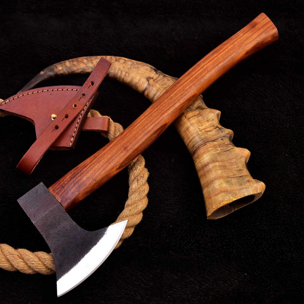 Der Griff besteht aus Hart Holz. Aufgrund des konischen Griffs liegt die Axt sehr gut in der Hand.
