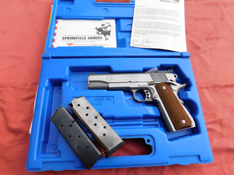 Springfield Trophy Match 1911 in Stainless Kal. 45 ACP mit TRT Visier verstellbar, Abzug mit Triggerstop, Beavertail, Compathammer, langer Führungsstange, lange Sicherung. Lauf innen spiegelblank und Profil scharf. Gültiger Beschuss vorhanden. Meiner Meinung nach leichte Gebrauchsspuren.