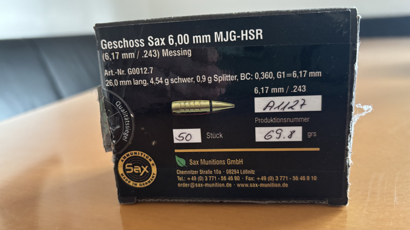 Verkaufe 40 MJG Messinggeschosse in 243/6 mm . 9 KJG der gleichen Firma Sax lege ich zum Testen bei, vermutlich sehr ähnliche TPL und Wirkung zu erwarten .