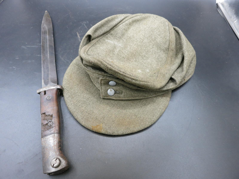 Deutsches Seitengewehr und Feldmütze. Mütze und SG wurden zusammen aufgefunden, deshalb gemeinsamer Verkauf als Konvolut.