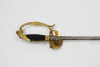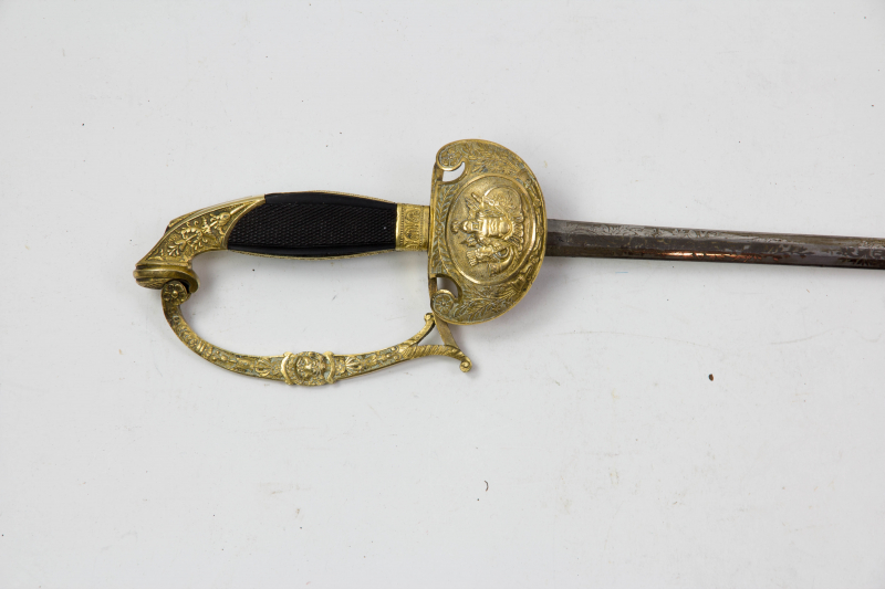 Degen, Bayern, um 1830, für höhere Offiziere, feines, im Empirestil gefertigtes, feuervergoldetes Gefäß, geriffeltes Ebenholzgriffstück, mit Lorbeer verziertes Stichblatt, in der Mitte Kartusche mit Rüstung, Schild und Kriegsgirlanden, Papierstange alt abgebrochen, polierte, rhombische Stahlklinge mit feinen Mattätzungen von Ornamenten und Kriegsgirlanden, Klinge signiert München, Lederscheide mit vergoldeten Mundblech, Ortblech fehlt, Leder stark geschrumpft, hochwertiger Degen in feiner Qualität, Gebrauchsspuren. L: 94 cm.