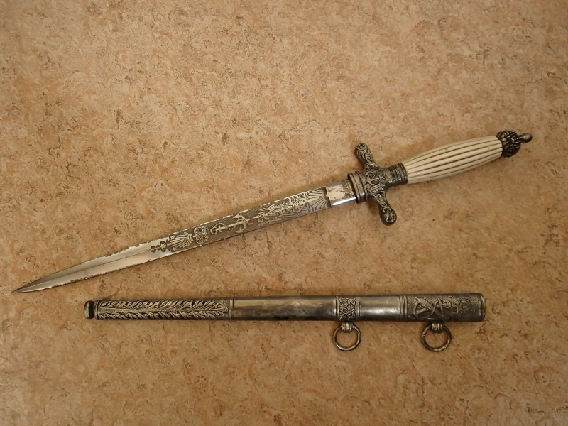 Zum Verkauf steht ein österreich-ungarischer Marinedolch Muster 1854. Der gut erhaltene Dolch ist 437 mm lang und 341 g (Scheide 86 g) schwer. Die schlanke zweischneidige Klinge ist beidseitig mit Ornamenten, Kaiserwappen und einem gekrönten Anker geätzt. Es findet sich der Hersteller " Haußmann in Wien".