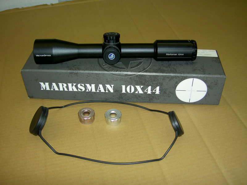 Verkauft wird hier ein 10x44 Vector Marksman mit cm / MRad / MilRad Klickverstellung, 30mm Mittelrohr, seitlicher Parallaxeverstellung und Absehen mit Markierungen, gebraucht aber soweit funktionsfähig, keine Absehenbeleuchtung. Nullbare, arretierbare Türme.