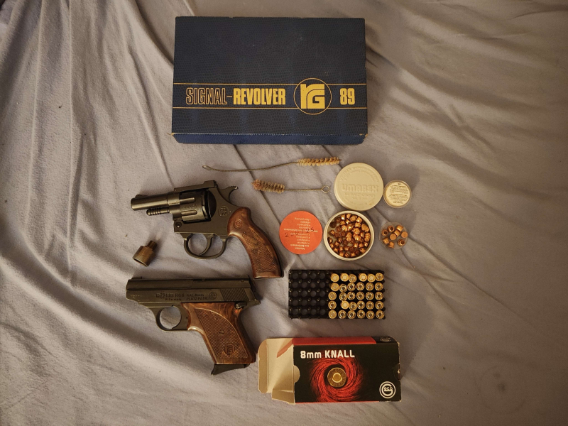Konvolut alter Schreckschusswaffen mit Zubehör und Munition.