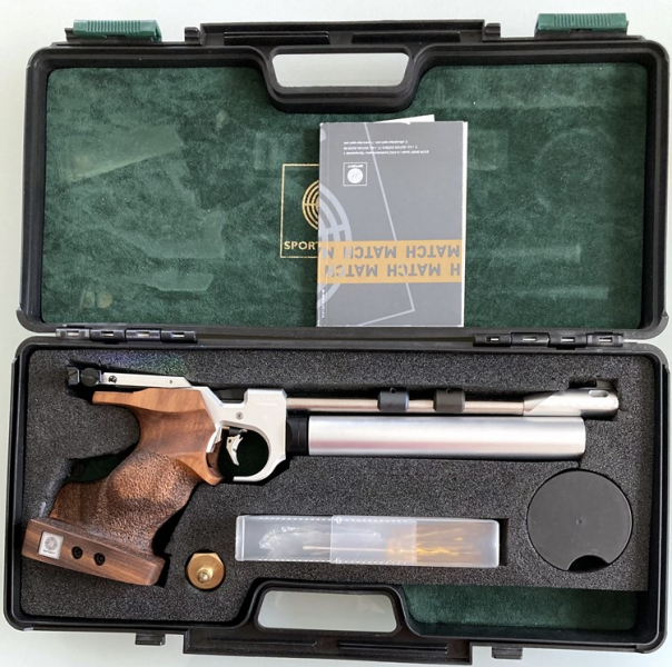 Angeboten wird eine Matschpistole STEYR LP 2 im Originalkoffer, Kaliber 4,5 mm/.177, Pressluftantrieb, Ladestiftsystem, ein Druckbehälter silber (Ablauftermin 04/2027) mit integriertem Manometer, vielseitig verstellbares Abzugssystem, in alle Richtungen verstellbarer Formgriff Größe L, zwei Laufgewichte 25 g, Bedienungsanleitung mit Erstanschussbild, Werkzeug und Füllstück. Gewicht ca. 905 g. Besonderheit: Visiereinheit von LP 10. Die Waffe ist technisch und optisch in einem Toppzustand und weißt kaum Gebrauchsspuren auf!