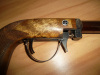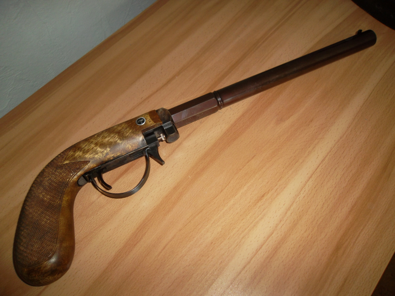 Carleton Unterhammer Target Perkussionspistole von Pedersoli im Kaliber .36 Das Hauptmerkmal dieser Pistole ist die Position des Pistons. Dieser ist horizontal unter dem Lauf angebracht. Das Schlagstück schlägt unter dem Lauf waagrecht nach vorne auf das Piston, hierdurch kaum Auswirkung auf die Lage der Pistole. Die Pistole hat einen vom Achtkant ins Runde gehenden Lauf, einen verstellbaren Druckpunktabzug und eine in der Höhe verstellbaren Kimme. Der Lauf ist bräuniert, die Metallteile sind buntgehärtet. Die Pistole ist laut Vorbesitzer von dem Vorderladerspezialisten Helmut Mohr in Mayen überarbeitet worden.