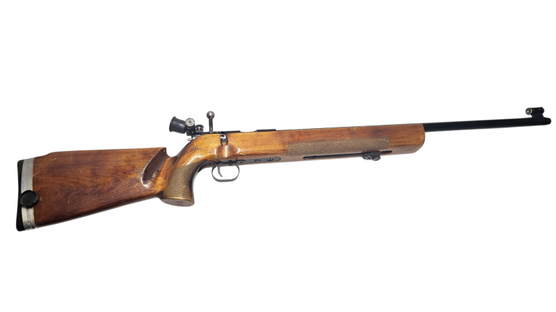 Angeboten wird im Kundenauftrag ein Einzellader Matchbüchse, Hersteller lt. NWR ist "Izhmash", Modell "VOSTOK CM II" im Kaliber .22lr in gebrauchtem aber solidem Zustand. Besonders ist Seitenmontage mit originalem Diopter. Sehr selten.