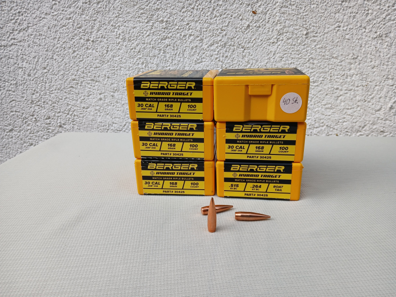 Hallo, wegen Geschosswechsel habe ich noch 540 Stück Berger Hybrid Target .308 168 Grain zu verkaufen. 5 Pakete sind noch verschlossen.