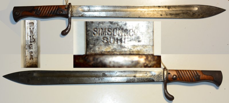 Deutsches Bajonett 98/05, Hersteller "Simson Suhl", Abnahme "W15", Klinge etwas fleckig, Knauf rostig, die Scheide fehlt