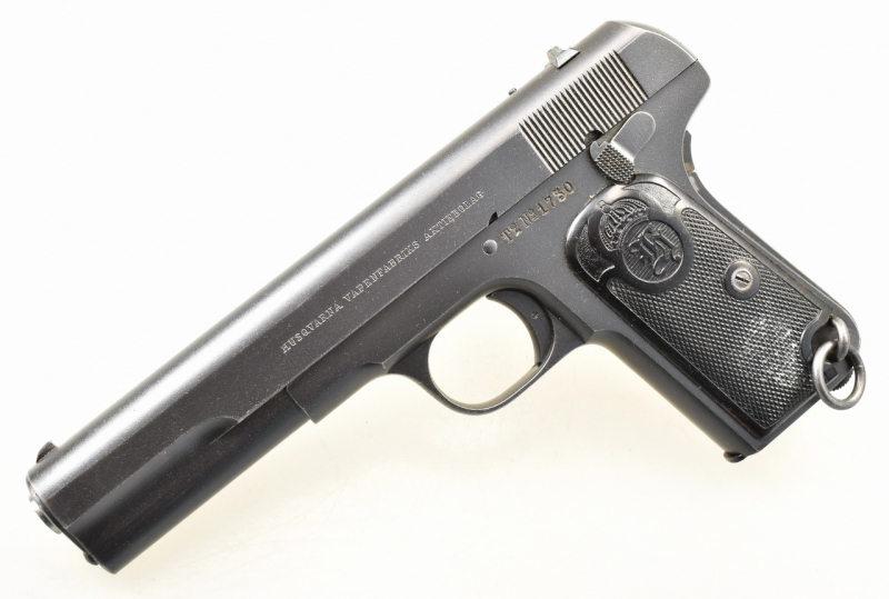 210mm lange und 960g schwere Single - Action Ganzstahl Militärpistole m/1907 ( FN - BROWNING Modell 1903 ) aus Produktion der schwedischen Husqvarna Vapenfabriks Aktiebolag. Die auf 4 mm M 20 konvertierte Originalwaffe weist Gebrauchs- und Lagerungsspuren auf. Details siehe Bilder.