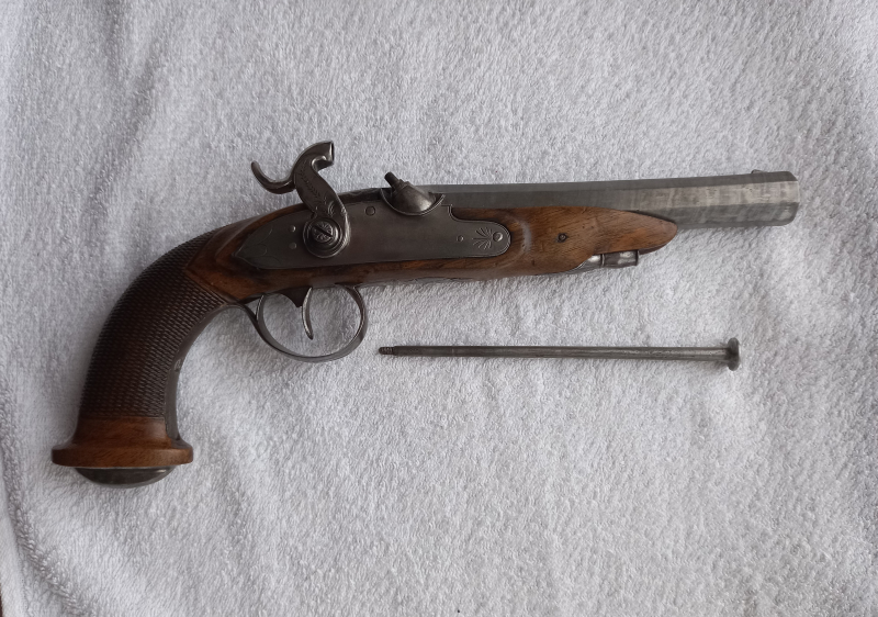achtkantiker Damastlauf, was typisch für hochwertige Offiziers- oder Duellpistolen war