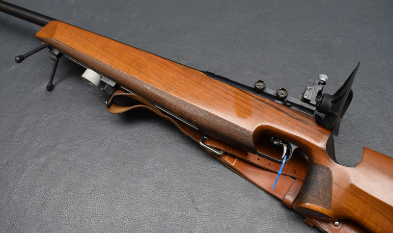21 mm dicker Matchlauf, 11 mm Schiene, Diopervisierung, Zylinderverschluss mit Flügelsicherung, einstellbarer Matchabzug. Nussbaumschaft mit verstellbarer Schaftkappe, 11mm UIT Schiene, HAndstop mit Riemen, Zweibein. Lauf sehr gut, Brünierung 96%, Schaft mit Gebrauchsspurren, Gebrauchtwaffe