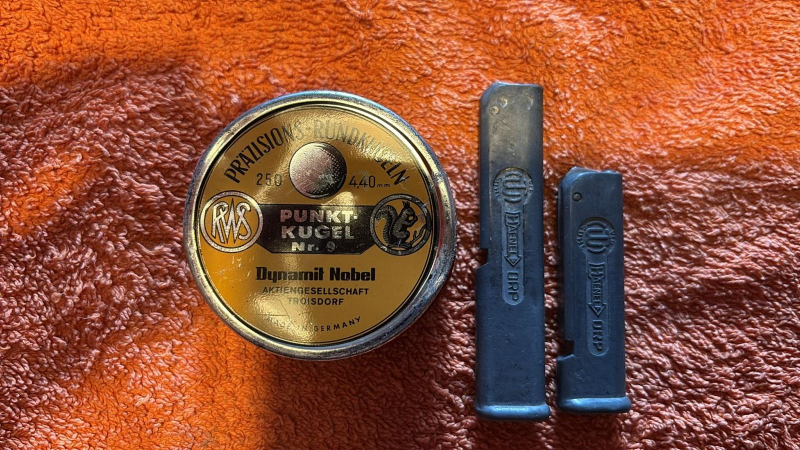 Diese beiden alten Magazine für Luftdruckwaffen sind 8 und 12 schüssig. Die kleine Dose mit den Rundkugeln lege ich dabei.
