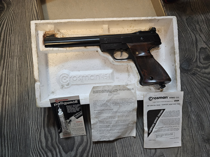 Angeboten wird eine Crosman 454 CO2-Pistole im Originalkarton, sie wurde hergestellt von 1972-1977.