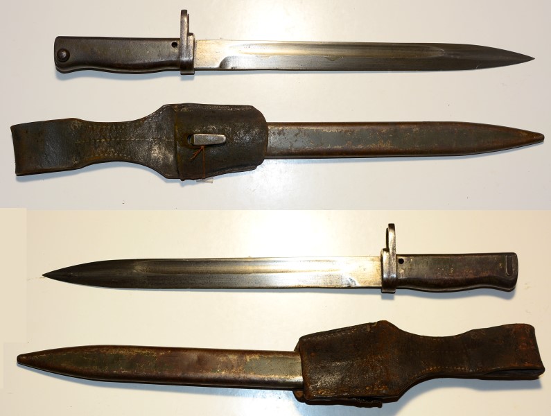 Deutsches Ersatzbajonett mit Ganzstahlgriff, 31,5 cm lange Klinge, keine Markierungen, auf dem Klingenrücken könnte sich ein schlecht eingeschlagener Abnahmestempel befinden, mit zugehöriger Scheide und Koppelschuh, guter Zustand