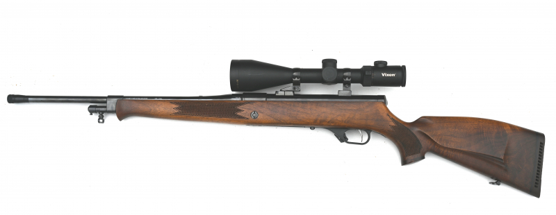 Solide und unverwüstliche österreichische Qualitätswaffe aus jahrzehntelangem Dornröschenschlaf, mit fabrikfrischem Zielfernrohr mit 11fach dimmbarem Leuchtpunkt, soeben mit neuer Knopfbatterie bestückt, tadellos funktionierend! Chassis wie neu! Mit originaler VIXEN-Schutzhülle.