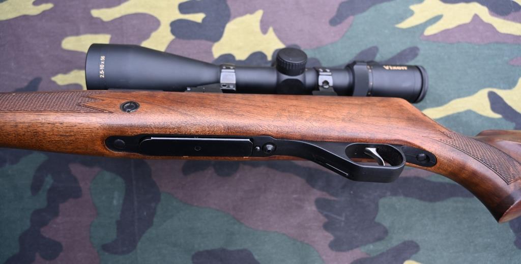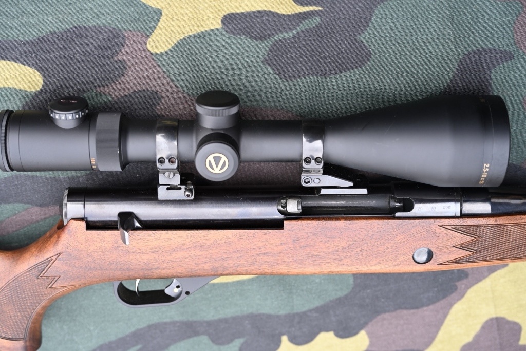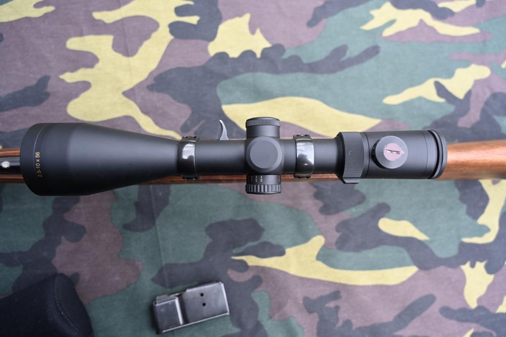 Dieses Zielfernrohr wurde 2024 aufwendig nachgerüstet, im Austausch gegen die vorherige Montage, wovon noch eine verschlossene Feingewindebohrung auf der Patronenlageroberseite und der Neubeschuss zeugen!