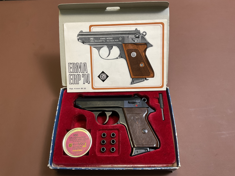 Zum Verkauf steht eine Pistole Erma ERP 74 im Kaliber 4 mm M20. Die Waffe befindet sich technisch in neuwertigem Zustand, jedoch löst sich der originale Lack allmählich auf.