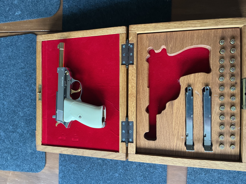 Biete ein Sammlerstück eine P38 in Gold GBB 4,5mm im Holzkoffer mit Schloss. Ein zweites Magazin ist auch dabei und Dekopatronen. Bei fragen bitte mailen. Keine Garantie oder Rücknahme.