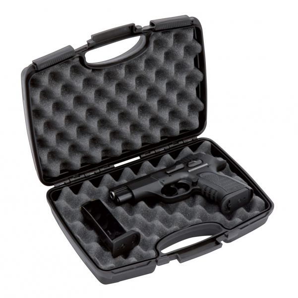 Es handelt sich hier um einen qualitativ ordentlichen und gleichzeitig günstigen Kurzwaffenkoffer aus hartem Kunststoff, mit vernünftigem Schiebeverschluss und Universaleinlage aus Schaumstoff. Natürlich verfügt der Koffer über die Möglichkeit, ein oder zwei Zahlen- bzw. Vorhängeschlösser anzubringen. Trotz seiner kompakten Abmessungen ist der Koffer für Waffen mit Lauflänge bis 6 Zoll gut geeignet!