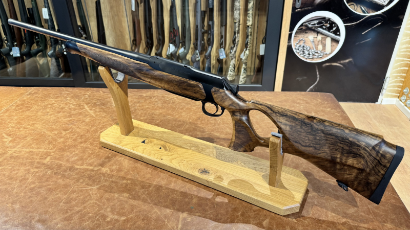 Ein Schmuckstück erster Güte: Veredelt durch DLC (Diamond like Carbon) beschichtete Oberflächen von Lauf und Gehäuse sowie einer Kammer mit Sonnenschliff. Die Kammergriffkugel ist gerändelt und mit der Sauer Schraube gekrönt. Eine luxuriöse Ausstattung, die in Verbindung mit einem Holzschaft voll zur Geltung kommt.