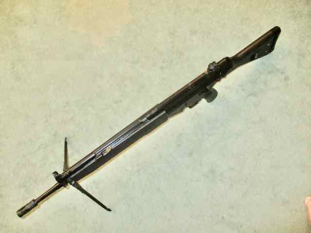 Schwarzer Trapez- Kunststoffhandschutz, Kunststoffschaft und Pistolengriff mit Zweibein.