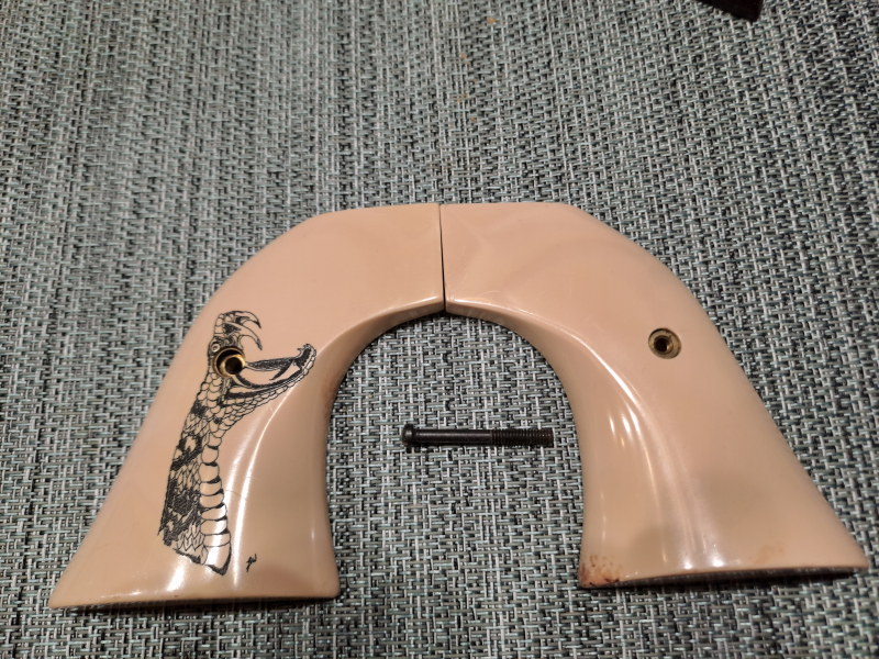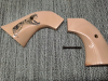 Elfenbeinfarbende und mit Scrimshaw verziehrte Griffschalen. Für .44 Vaquero Magnum.