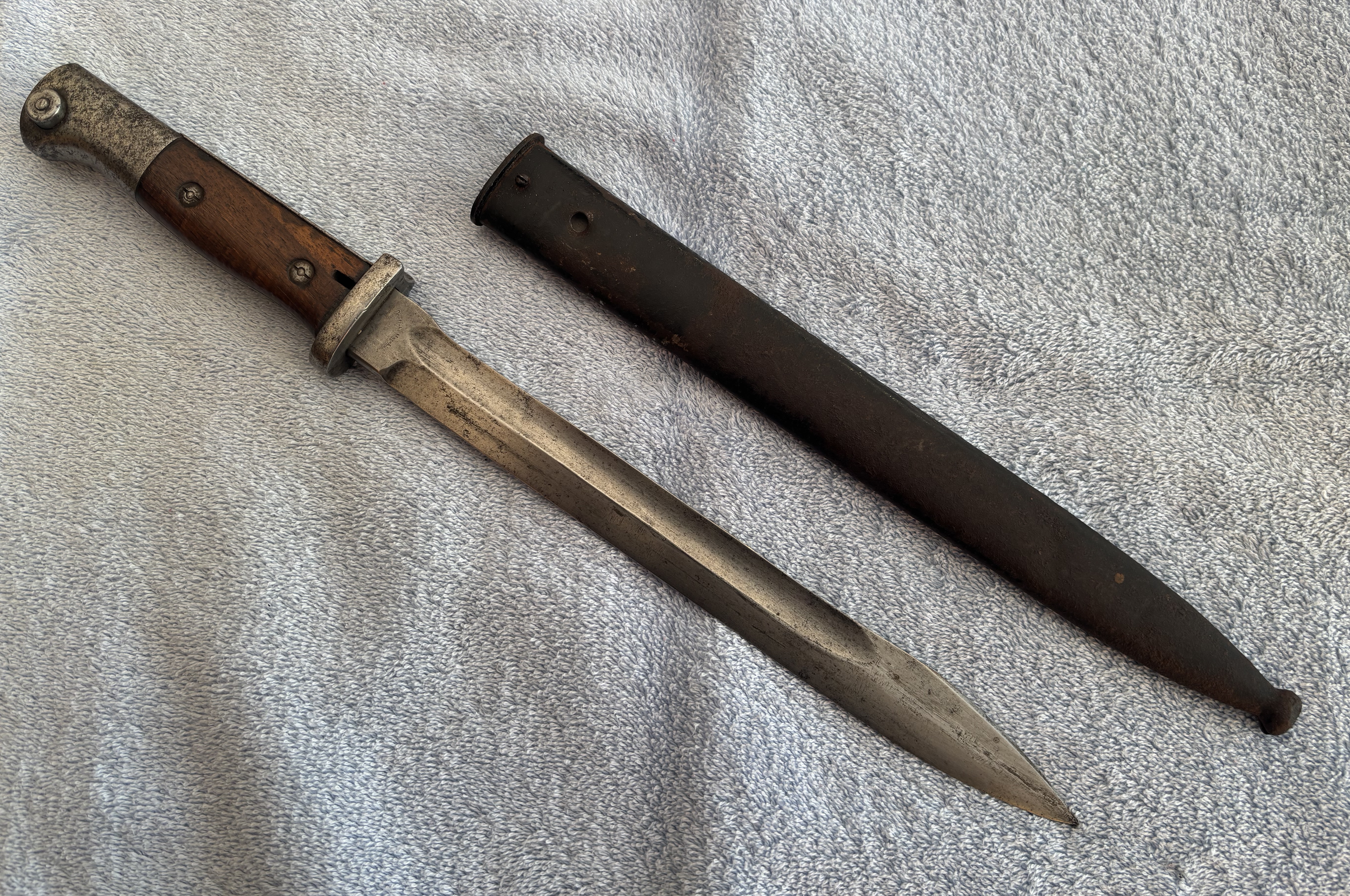 Baïonnette Allemande époque WW1 fabrication Bayard et Gottlieb avec fourreau fer (manque attaché) Les photos sont descriptives Expédition en Europe recommandée et assurée 25 € en France 15€