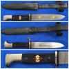 RZM M7/18 aus SOLINGEN. Es befindet sich in einem guten Zustand mit Gebrauchsspuren, da es ja auch benutzt wurde. Die Klinge hat eine schöne Patina, länge 140mm. Stoßleder ist OK. Hersteller und Devise sind gut lesbar. Die magnetische Stahlblechscheide hat eine schöne Brünierung und zwei innenliegende Haltefedern. Trageleder Top.