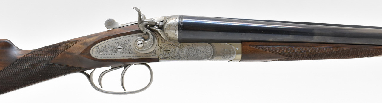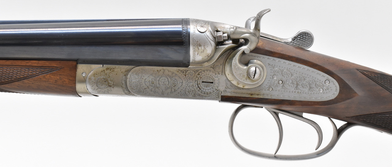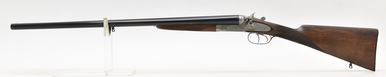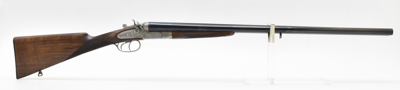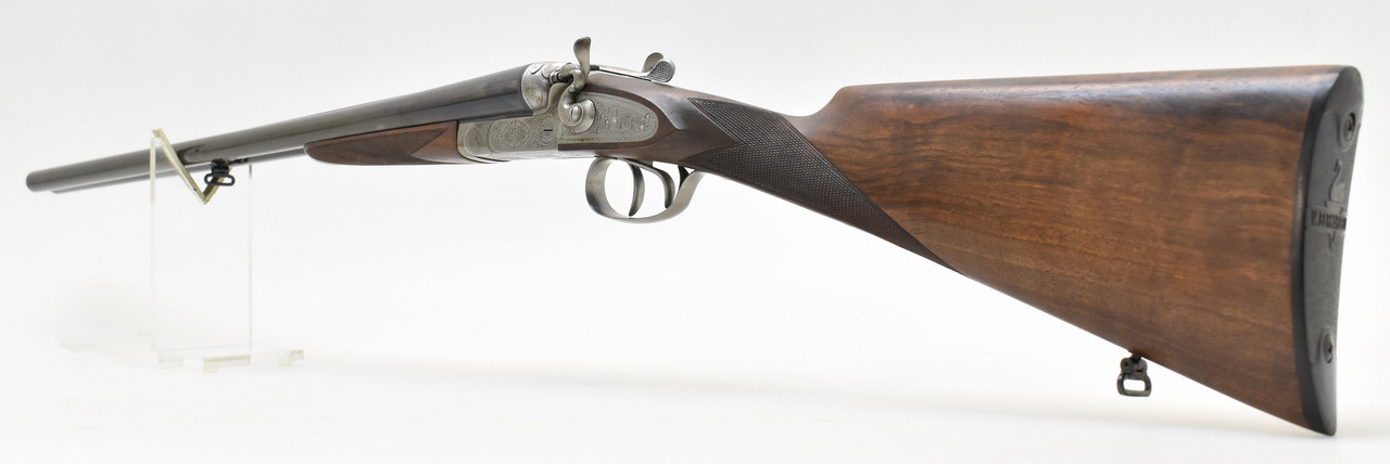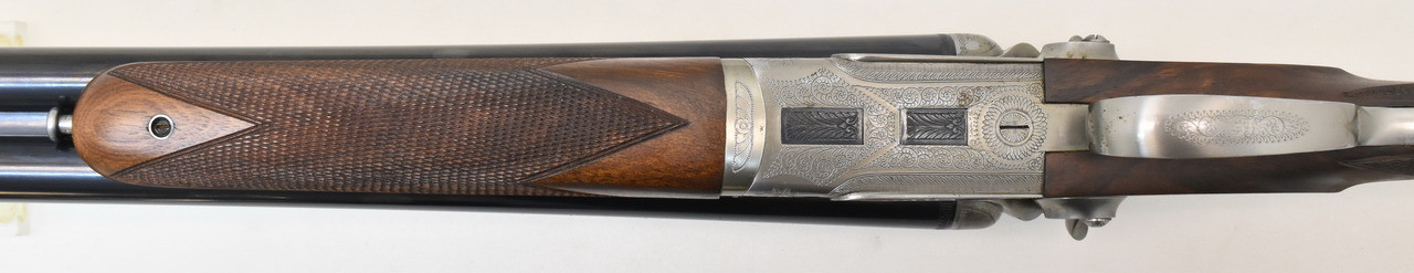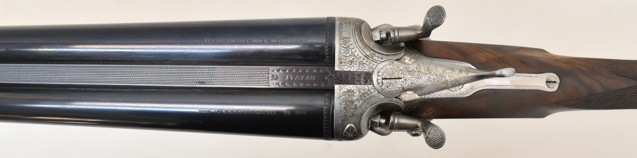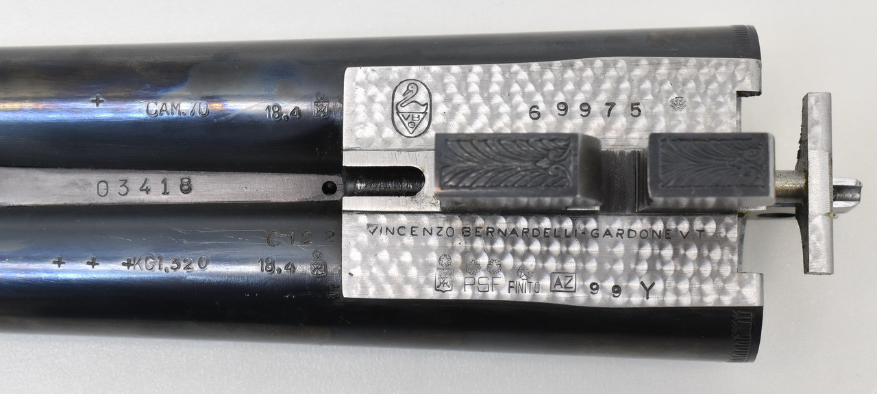 Italienische Querflinte mit halb-voll Choke von Vincenzo Bernadelli, Gardone . Die Schlossplatten und die Läufe haben winzige Rostanhaftungen, innen sind die Läufe blank mit kleinen Schussriefen. Hähne und Schlossplatten mit dezenter Arabeskengravur. Der Oberhebel ist schwergängig. Doppelte Laufhakenverriegelung mit Schienenverlängerung. Schaftlänge 36cm ( gemessen vorderer Abzug bis Mitte Schaftkappe.) Beschuss von 1990.