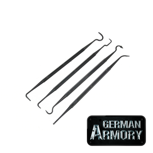 Die Nylonhaken eignen sich ideal um Schmauchspuren und Pulverreste aus Ecken und Löchern zu kratzen ohne das Finish zu beschädigen. Die Haken sind auch sehr hilfreich beim Arbeiten an Abzugsgruppen um Federn zu platzieren.