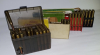 38 Patronen in einer beschädigten MIDWAY Plastikbox mit unbekannten Geschoßen (davon vermutlich 24 Stück handgeladen). Die Beschädigung ist vorne links im Bild ersichtlich.