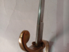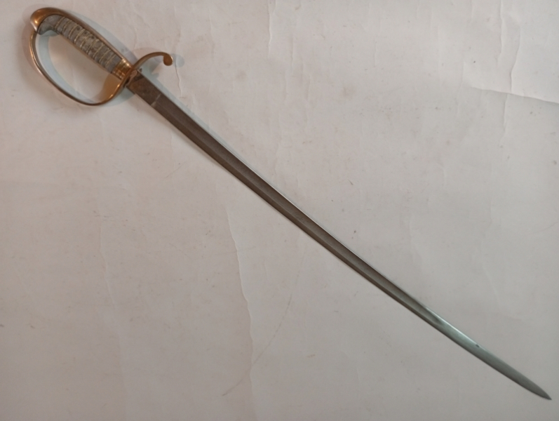 Germanischer Offizierssäbel. Beschläge aus Neusilber und Rochenhaut. Ovale Klinge mit langem Rücken, an der Zwinge befestigt. Flacher Verbindungsbogen und tropfenförmiger, gebogener Parierstange. Holzgriff mit filigraner Rochenhaut überzogen. Gebogene Klinge mit Hohlkehlen. Ohne Scheide. Entstehungszeit: Ende des 19., Anfang des 20. Jahrhunderts.