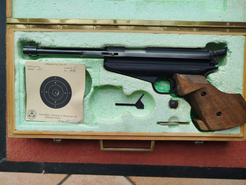 Verkaufe Feinwerkbau Luftpistole LP 65 mit ergonomischem Griff im Original Holzkoffer.