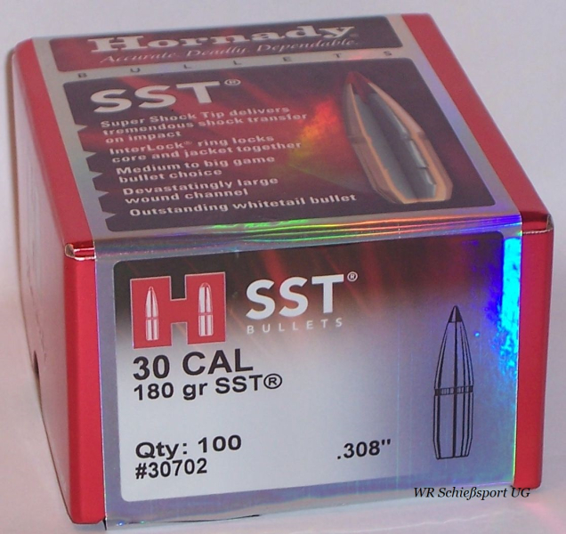 Hornady SST - Ideal für die Drück-, Gebirgs- und Trophäenjagd! Das Hornady SST (Super Shock Tipped) Geschoss ist DAS Wirkungswunder von Hornady! Es bietet maximale Geschwindigkeit - im Flug und in der Wirkung! Durch die langgestreckte Sekant-Ogiv-Form mit Polymerspitze und Torpedoheck besitzt das SST eine Top-Präzision sowie maximale Reichweite und Ziel-Energie. Die verdeckte Polymerhohlspitze sorgt für eine blitzartige Geschoßexpansion und maximale Energieabgabe für kürzeste Fluchtstrecken. Eine tiefe Penetration wird durch den antimongehärterte Bleikern und Geschossmantel mit Interlockring erreicht.