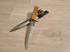 Zum Verkauf kommt hier eine Reproduktion eines Grabendolches aus dem Ersten Weltkrieg. Wurde nur als Dekoobjekt benutzt, die Klinge hat jedoch leichte Schleifspuren vom Aus- und Einstecken in die Scheide. Siehe Bilder. Gestempelt ist die Klinge mit "Gottlieb Solingen" auf der einen und dem Herstellerstempel auf der anderen Seite.