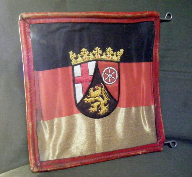 Wirklich seltenes und einmaliges Stück , Fahrzeug Stander Dienstfahrzeug des Regieruns Präsidenten von Rhl Pfalz aus den 50ziger- 60ziger Jahren . Seidenstickerei unter Plastikabdeckung rundherum in Leder eingefasst . Zustand siehe Fotos einmaliges und seltenes Stück .