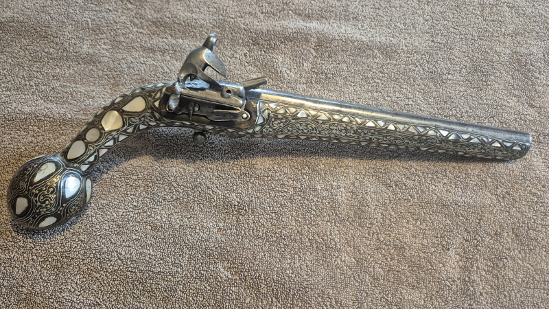 anatol.oder kaukas.Miqueletpistole 41cm L.Kal.15 mm.Konischer Eisenlauf mit Resten eingelassener Silberzier,die Laufhalterung etwas nach unten gegbogen ! recht kleines Miqueletschloss,Funtion nicht geprüft,Kugelabzug aus Eisen,aufwendig gearbeiteter Schaft mit Perlmutteinlagen,florale Silberdrahtranken,der typische Kugelknauf mit Messingblätter verziert.Sehr seltene,dekorative Waffe,nicht mehr zum Schießen geeignet,guter Erhaltungszustand