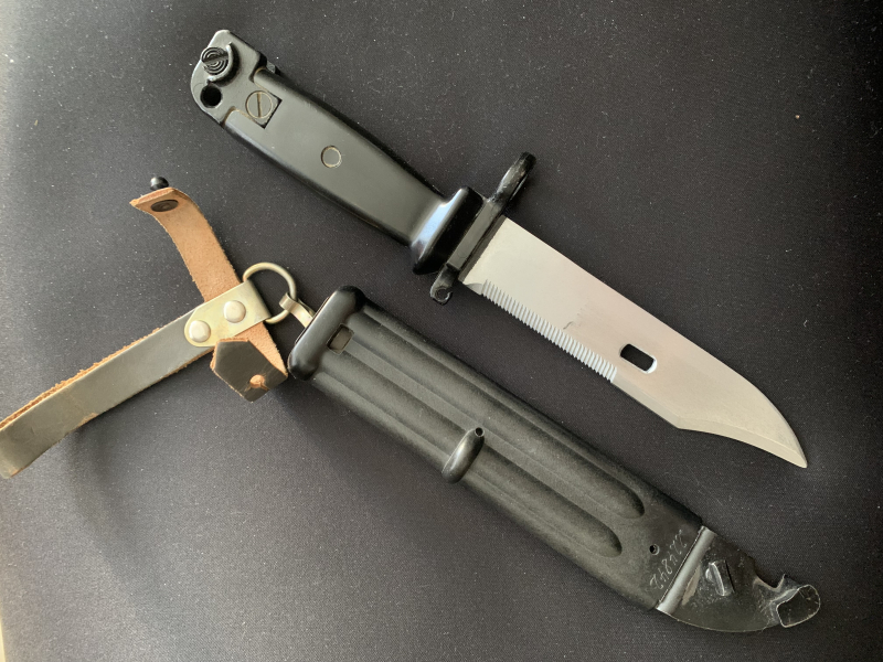 Bajonett und scheide kann man als Drahtschere zusammensetzen.